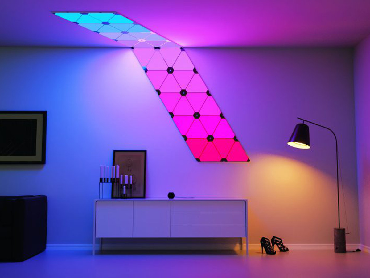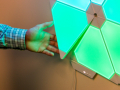Для установки светодиодных панелей не требуется ничего, кроме самих треугольников. Каждая панель крепится к стене с любой поверхностью на двухстороннюю монтажную ленту. Модульная конструкция позволяет собирать вместе до 30 панелей, причем с любой стороны. Примечательно, что питание подается только к одной панели (не важно какой) от контроллера, а от нее по цепной реакции электроэнергия поступает ко всем остальным. Включать систему и переключаться между режимами вы можете и с помощью контроллера, расположенного на кабеле питания, не запуская приложение.