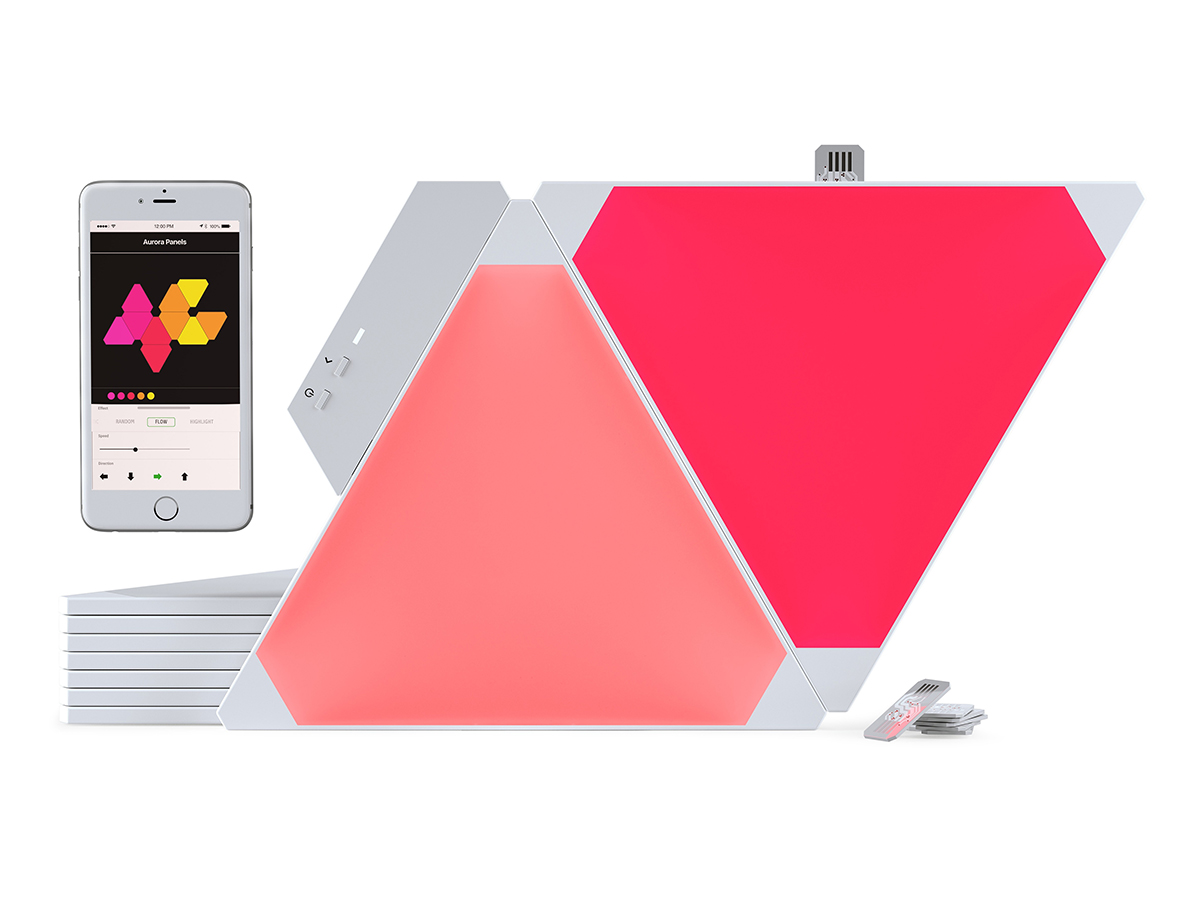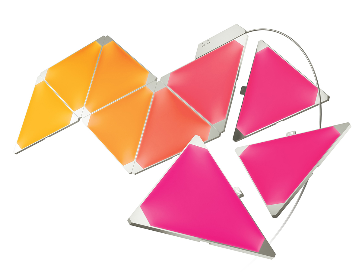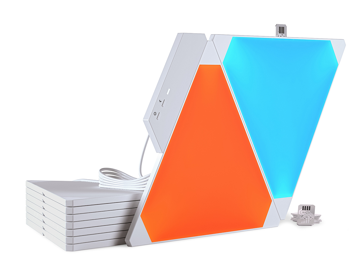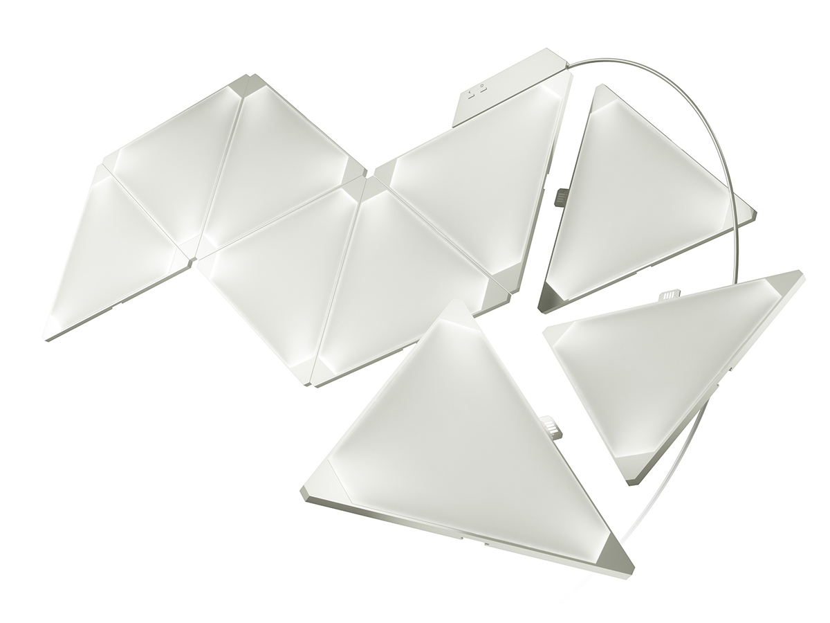 Светодиодные модульные панели выполнены в форме равносторонних треугольников со сторонами 24 см, высота панели — 21 см. Благодаря уникальному креплению в виде конструктора можно соединять треугольные ячейки разными гранями и создавать причудливые геометрические фигуры. Цвет каждой панели Aurora, яркость и контрастность ее свечения устанавливается в приложении Nanoleaf Smarter Series.