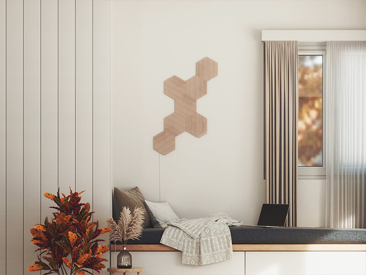Установить Nanoleaf Elements проще, чем поместить фотографию в рамку. Просто используйте липкий скотч для крепления панелей к стене — и создайте желаемую форму системы.
